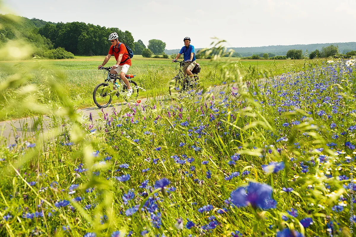Radelt man weiter, genießt man schon bald rechter Hand den Blick auf den Spitzelberg und das Auf und Ab der Fränkischen Schweiz. Wer im Frühsommer radelt, entdeckt am Wegrand zudem in den Bäumen eine rote Köstlichkeit, für die die Fränkische Schweiz besonders berühmt ist: die Kirschen. Die Region ist das größte zusammenhängende Anbaugebiet für Süßkirschen in Deutschland.